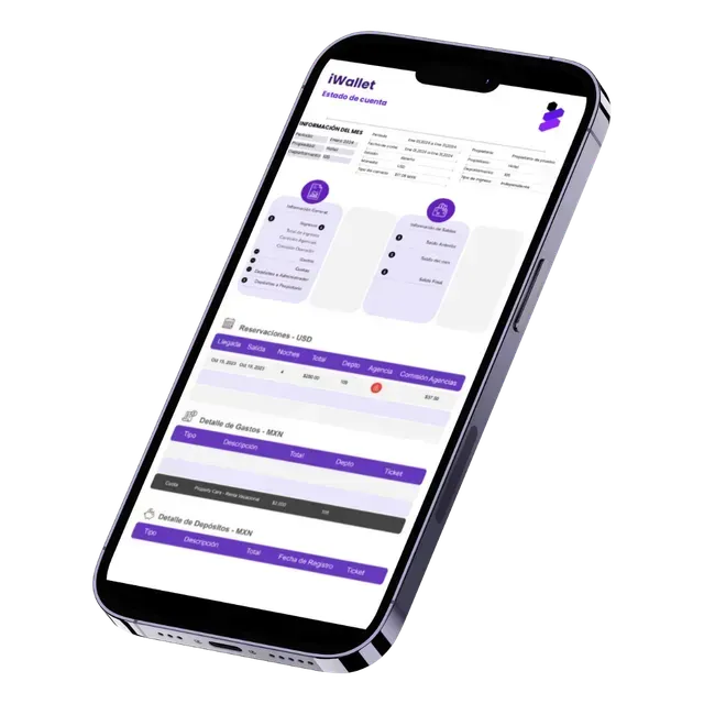 Realiza reportes transparentes e instantáneos . Di adiós a las hojas de calculo; con iWallet, los informes llegan a tu propietario al instante y visibles desde su smartphone.